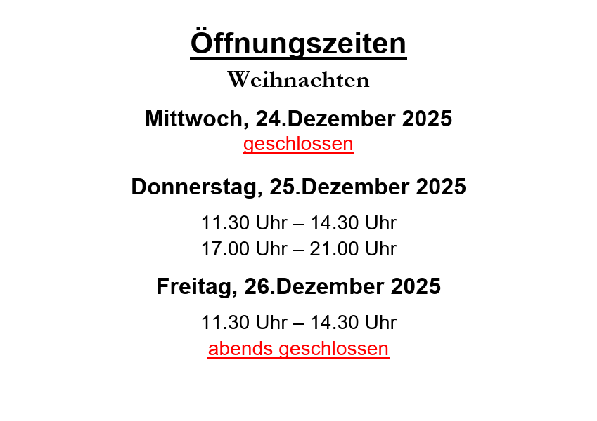 | Sonn- u. Feiertag | 11:30 bis 14:00 | 17:30 bis 21:00 |